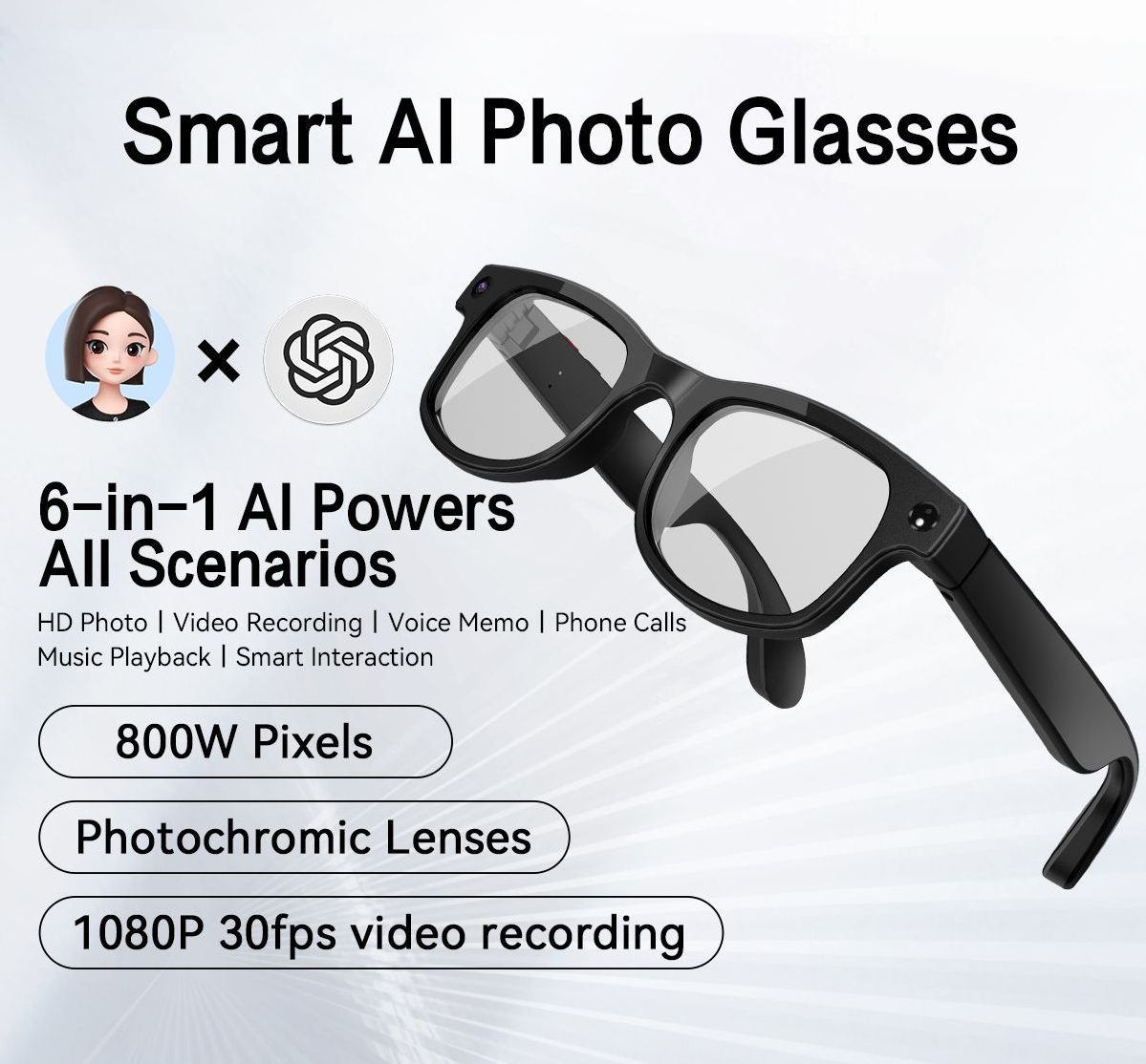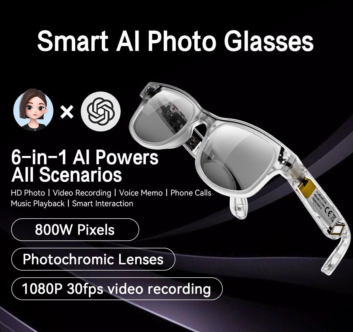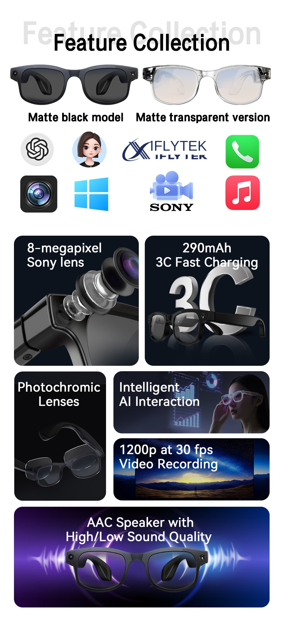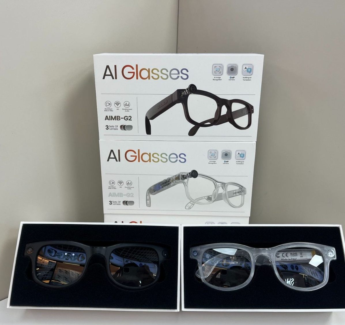 | Color | Black AIMB-G2 smart glasses-transparent (sunglasses + anti-blue light + brown lenses), White AIMB-G2 smart glasses-transparent (sunglasses + anti-blue light + brown lenses) |